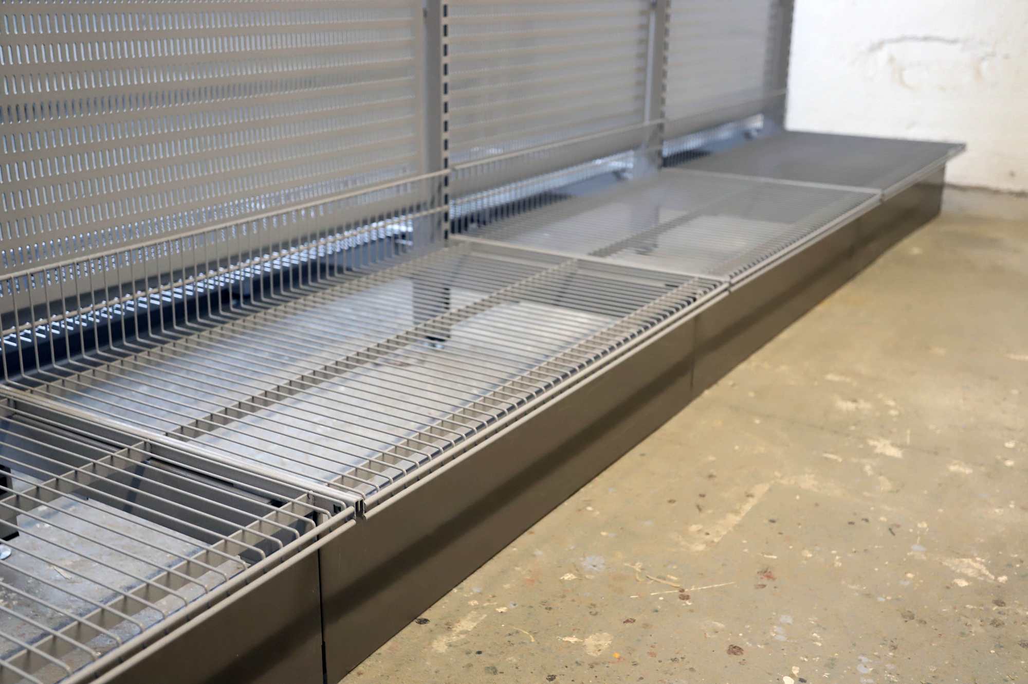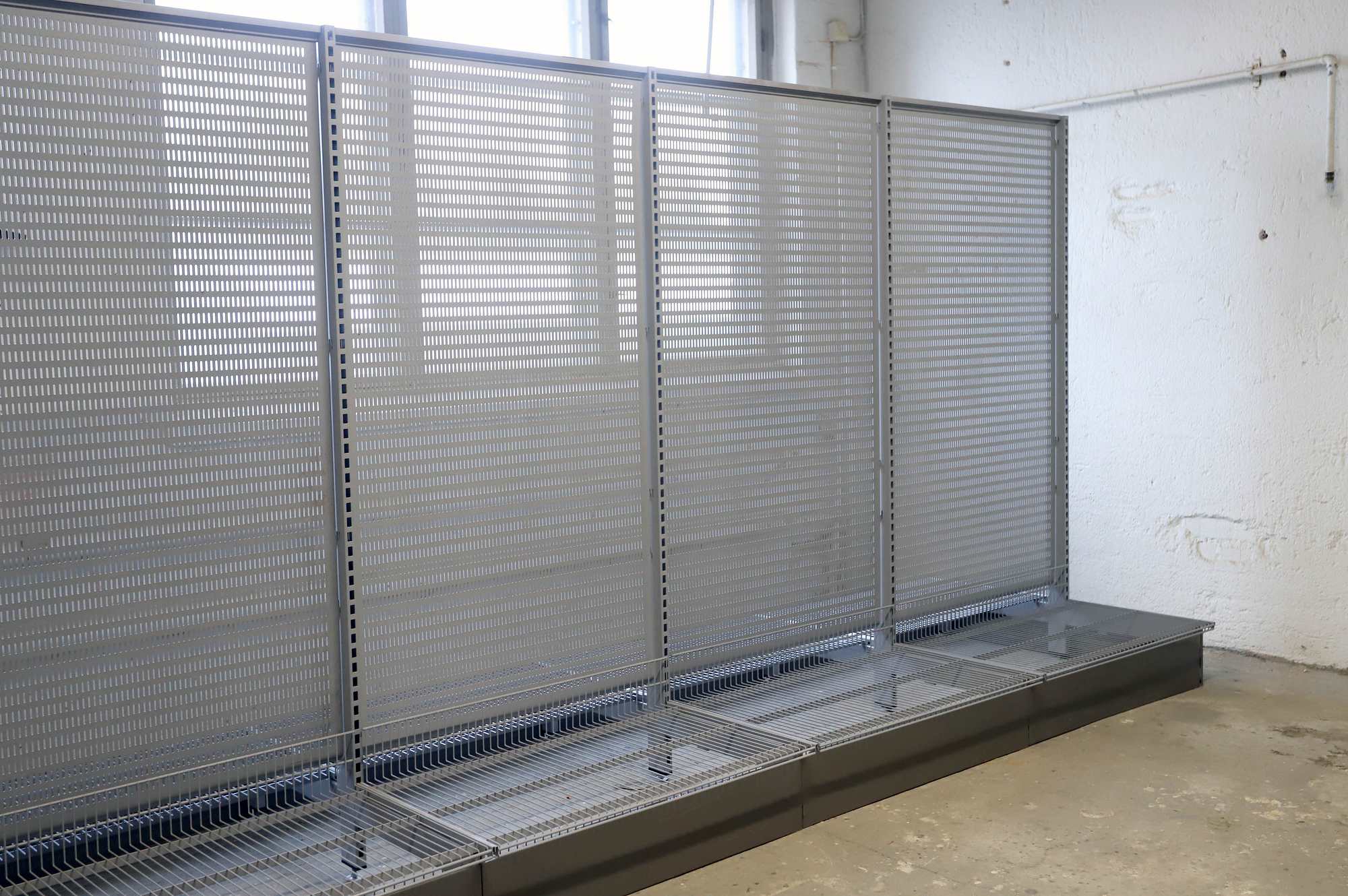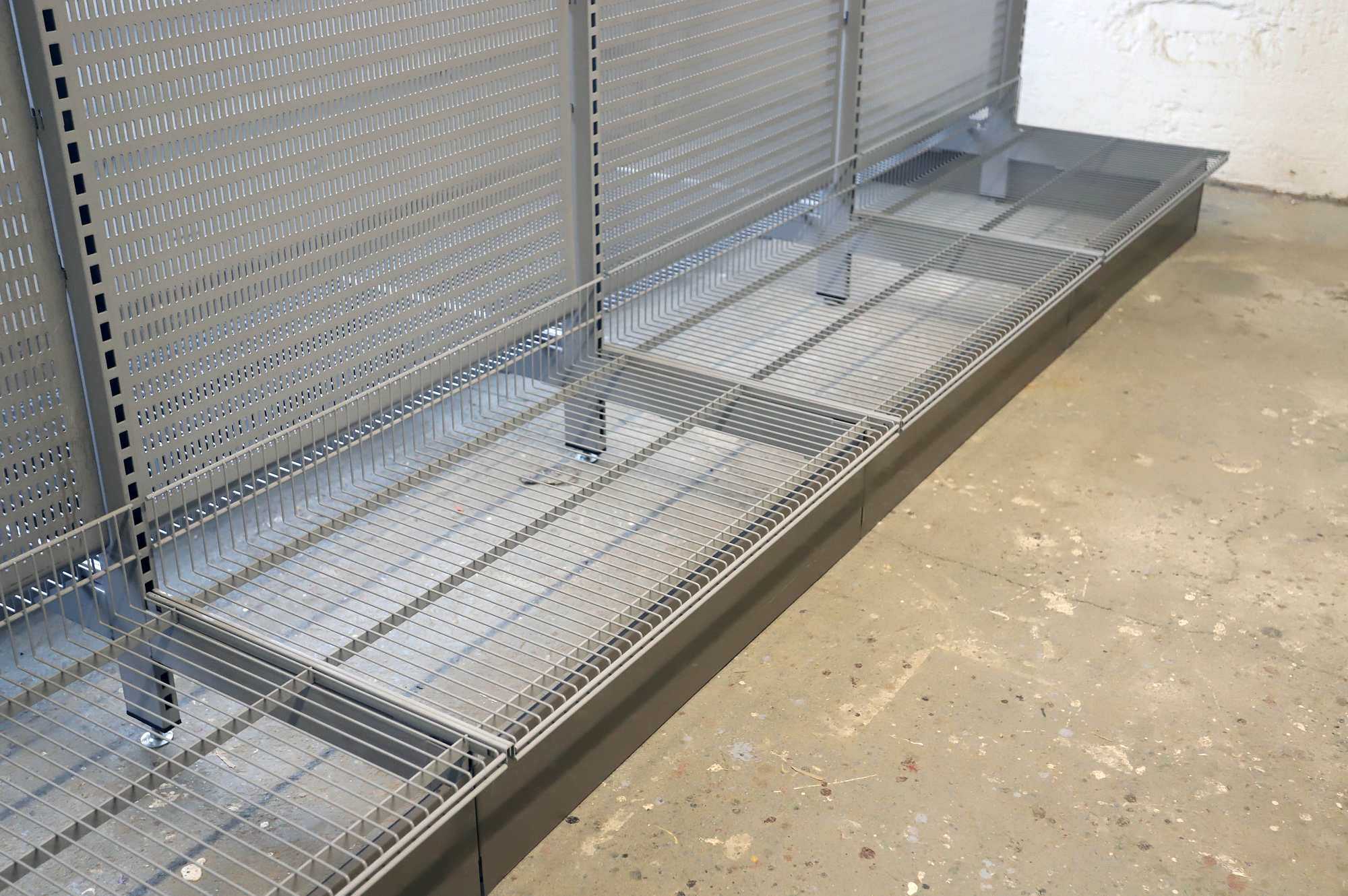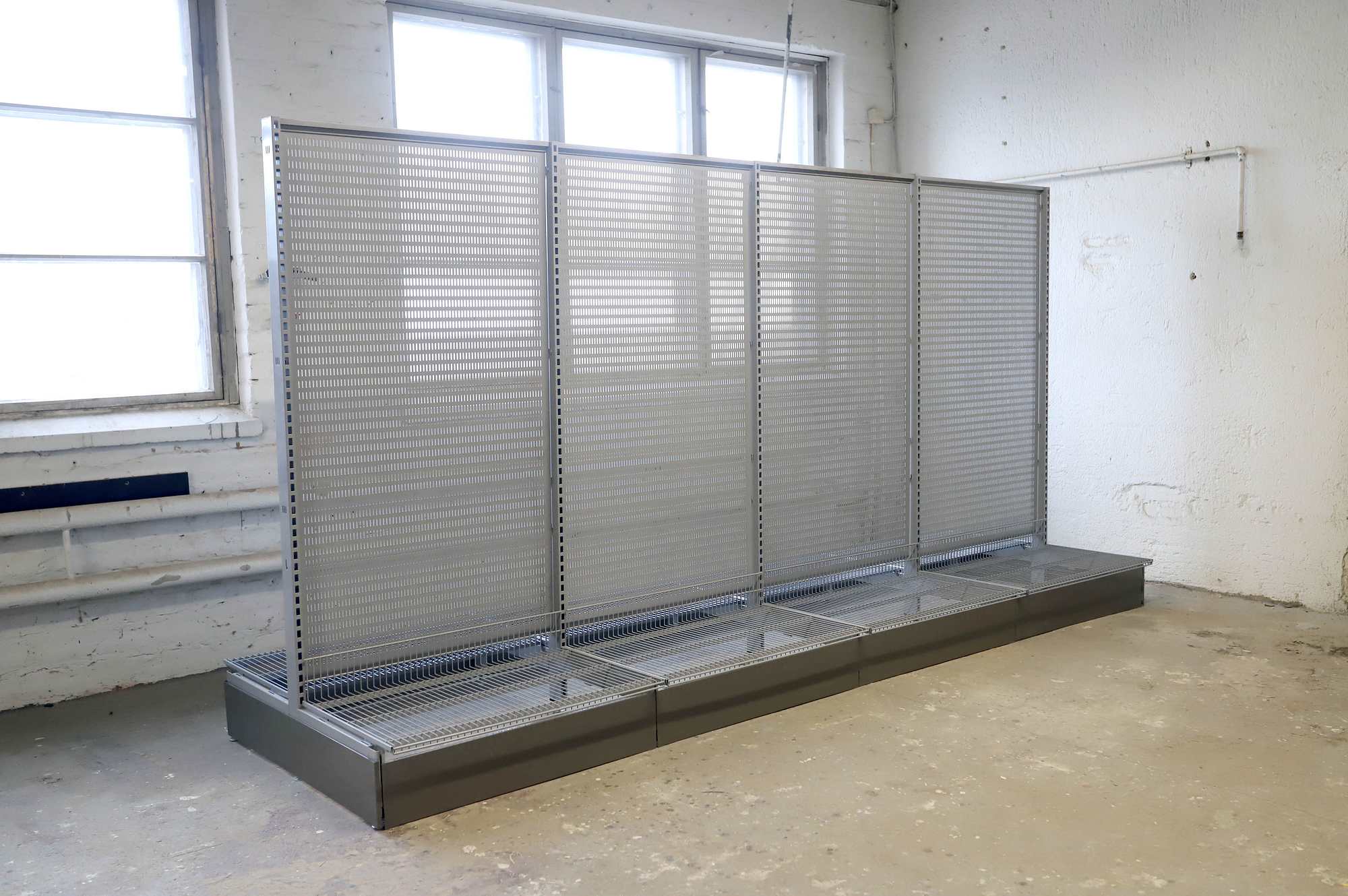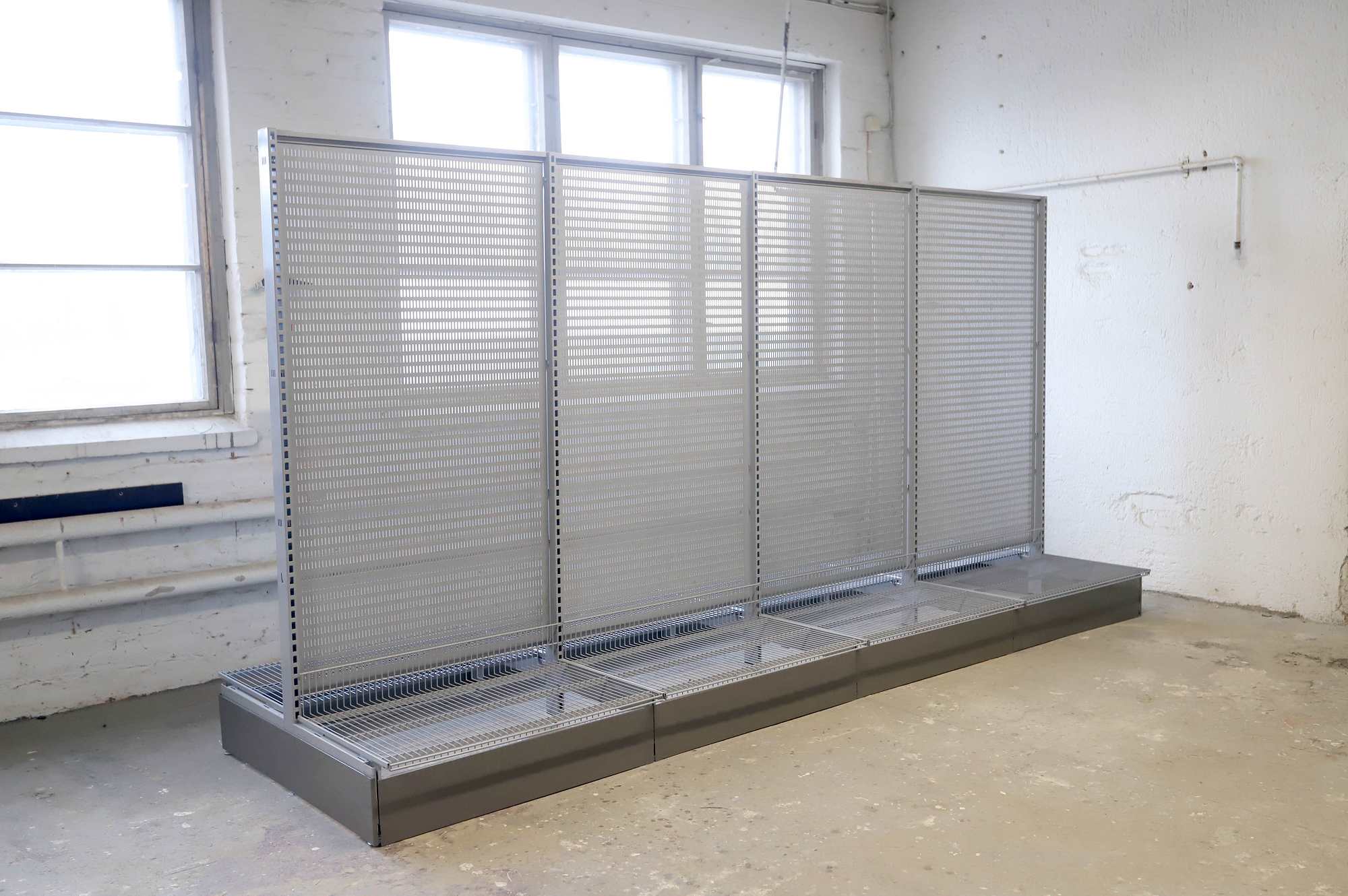 Korkeus 185cm, leveys 363cm, syvyys 113cm. Perusosa, sisältää 5 T-jalkaa, 4 taustalevyä, 8 lankakorihyllyä kannakkeineen ja potkupellit sivuihin ja päätyihin.