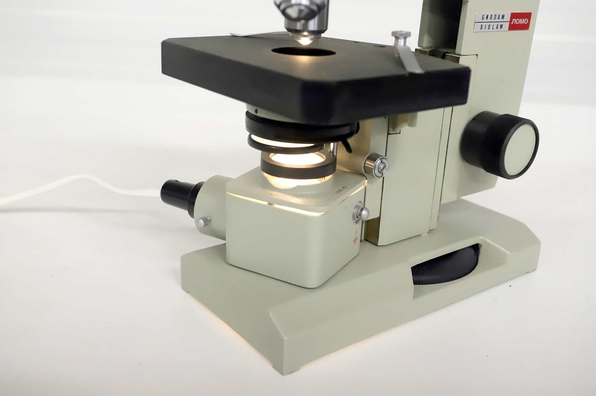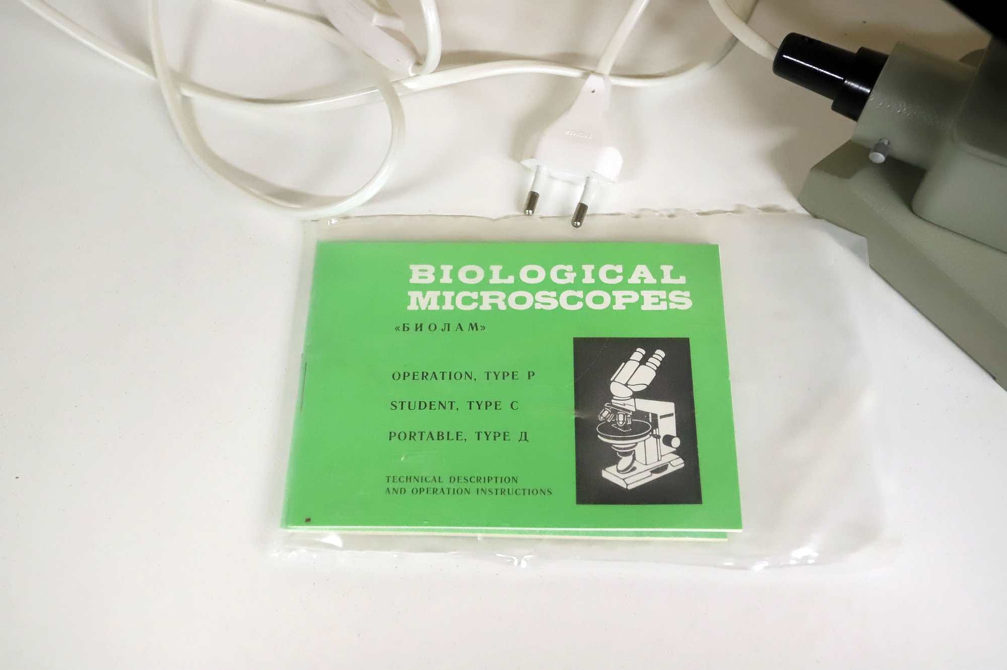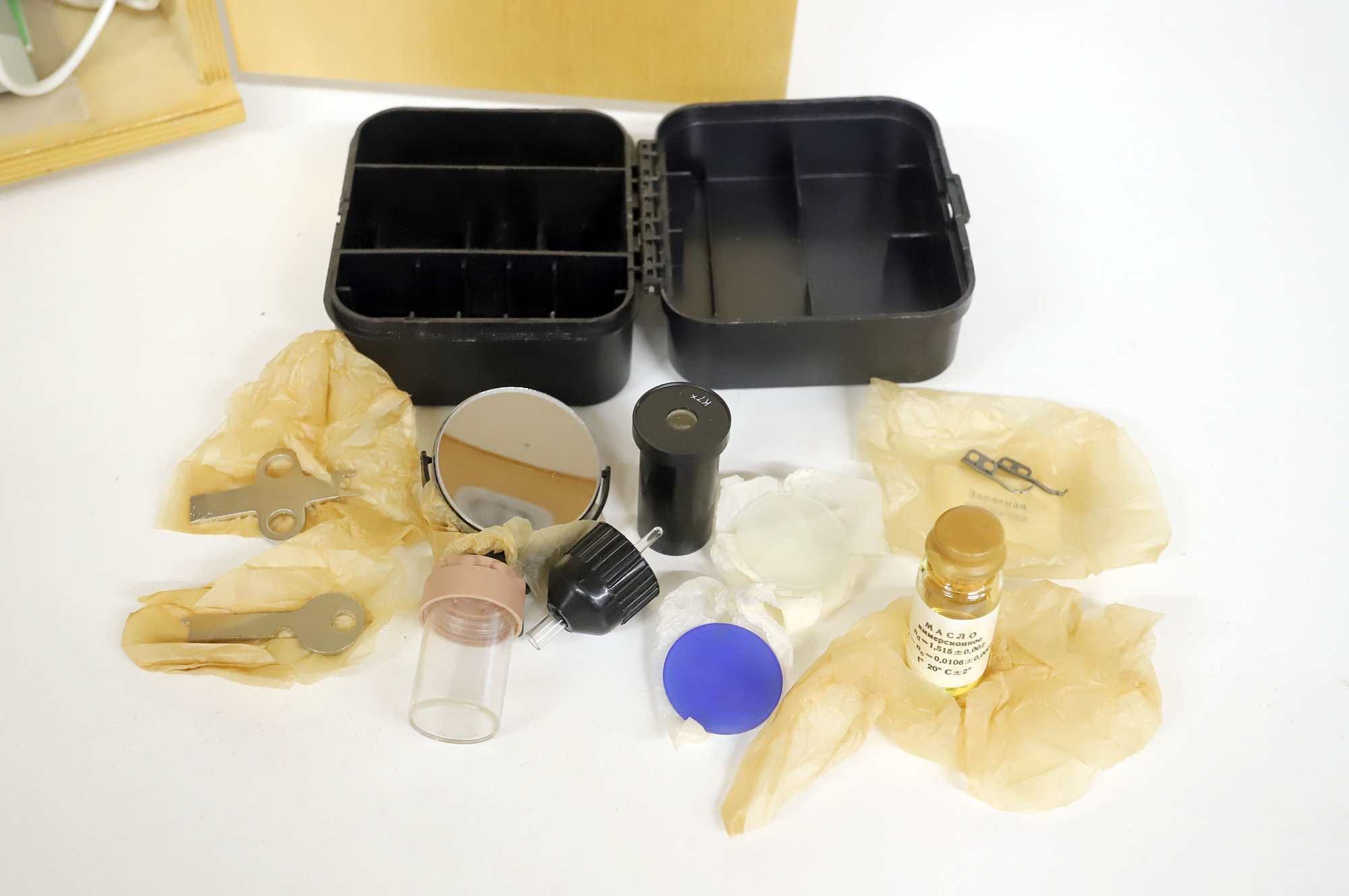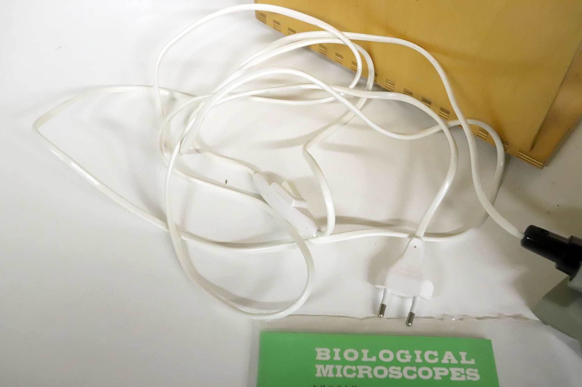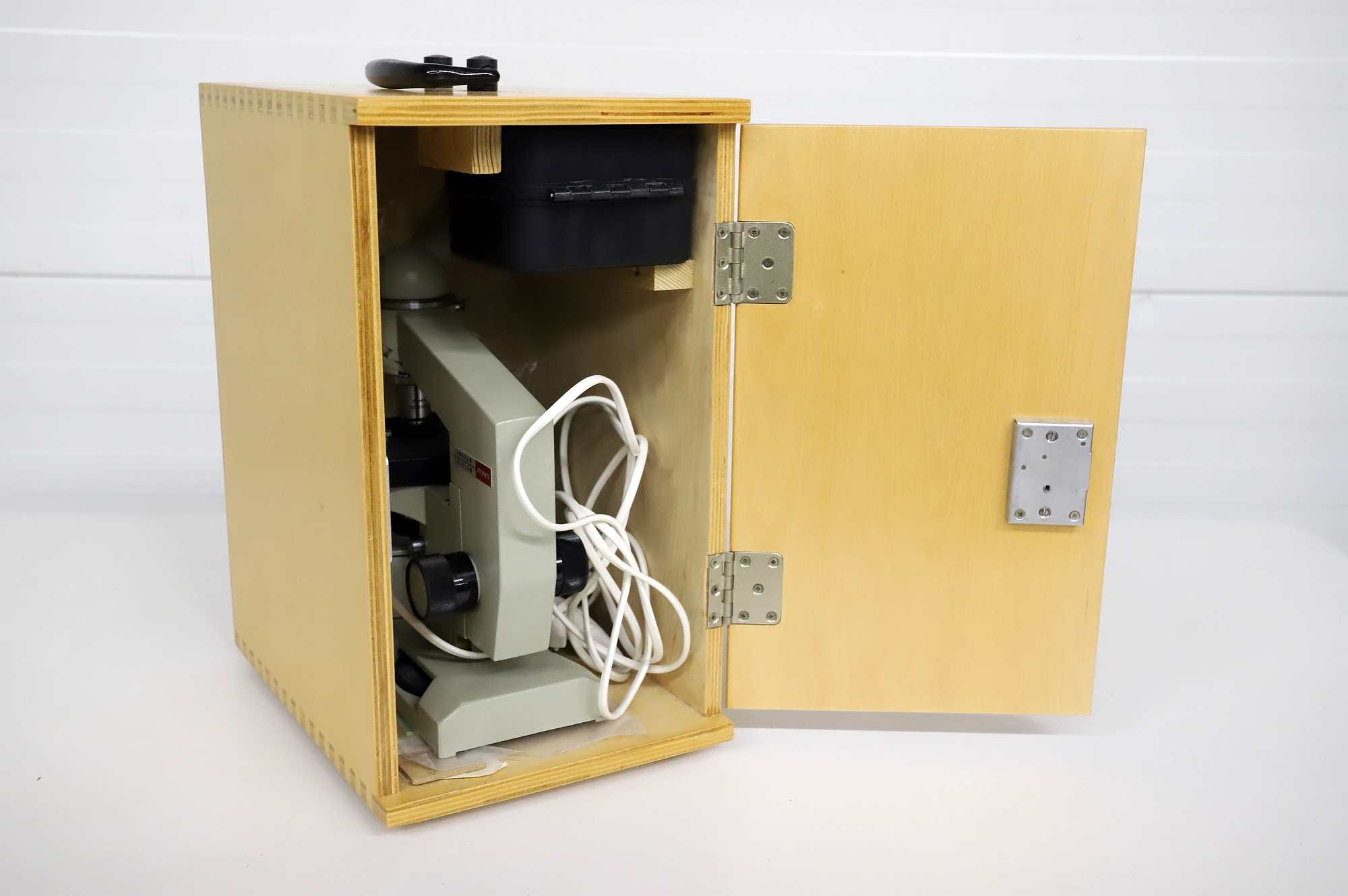Nomo Biolam-mikroskooppi vanerilaatikolla ja varaosilla