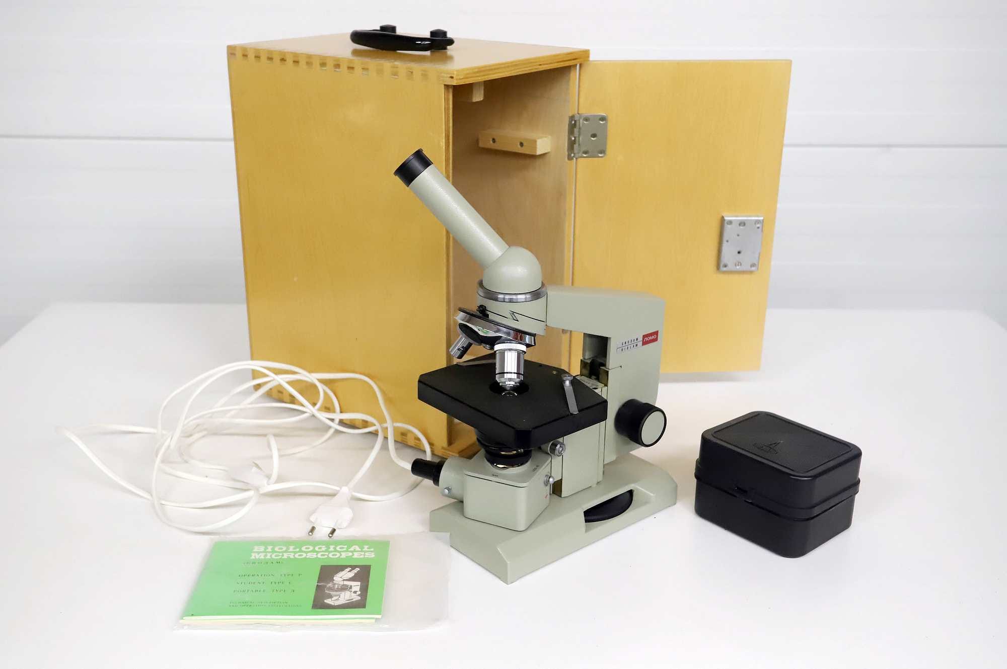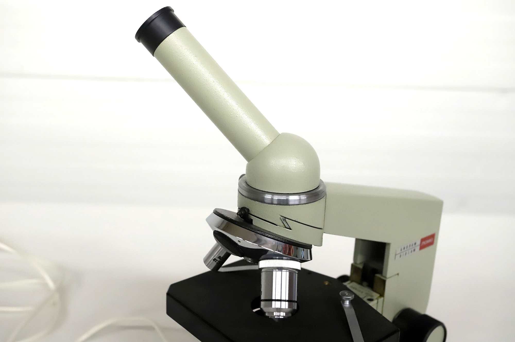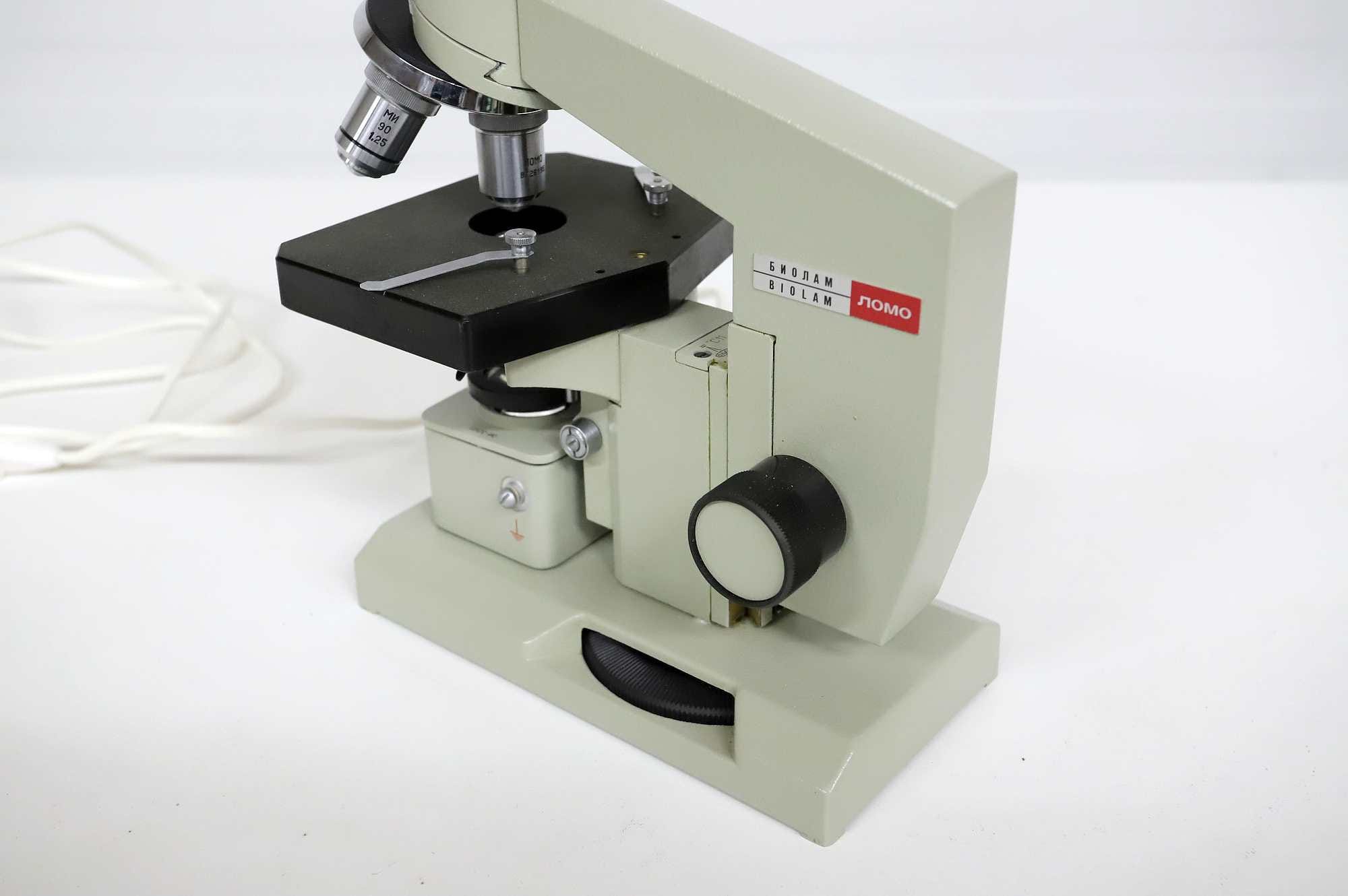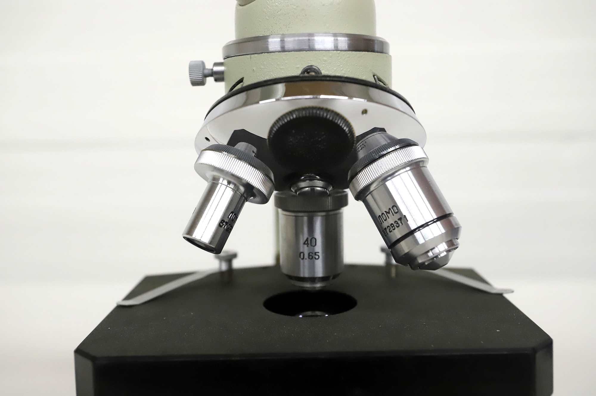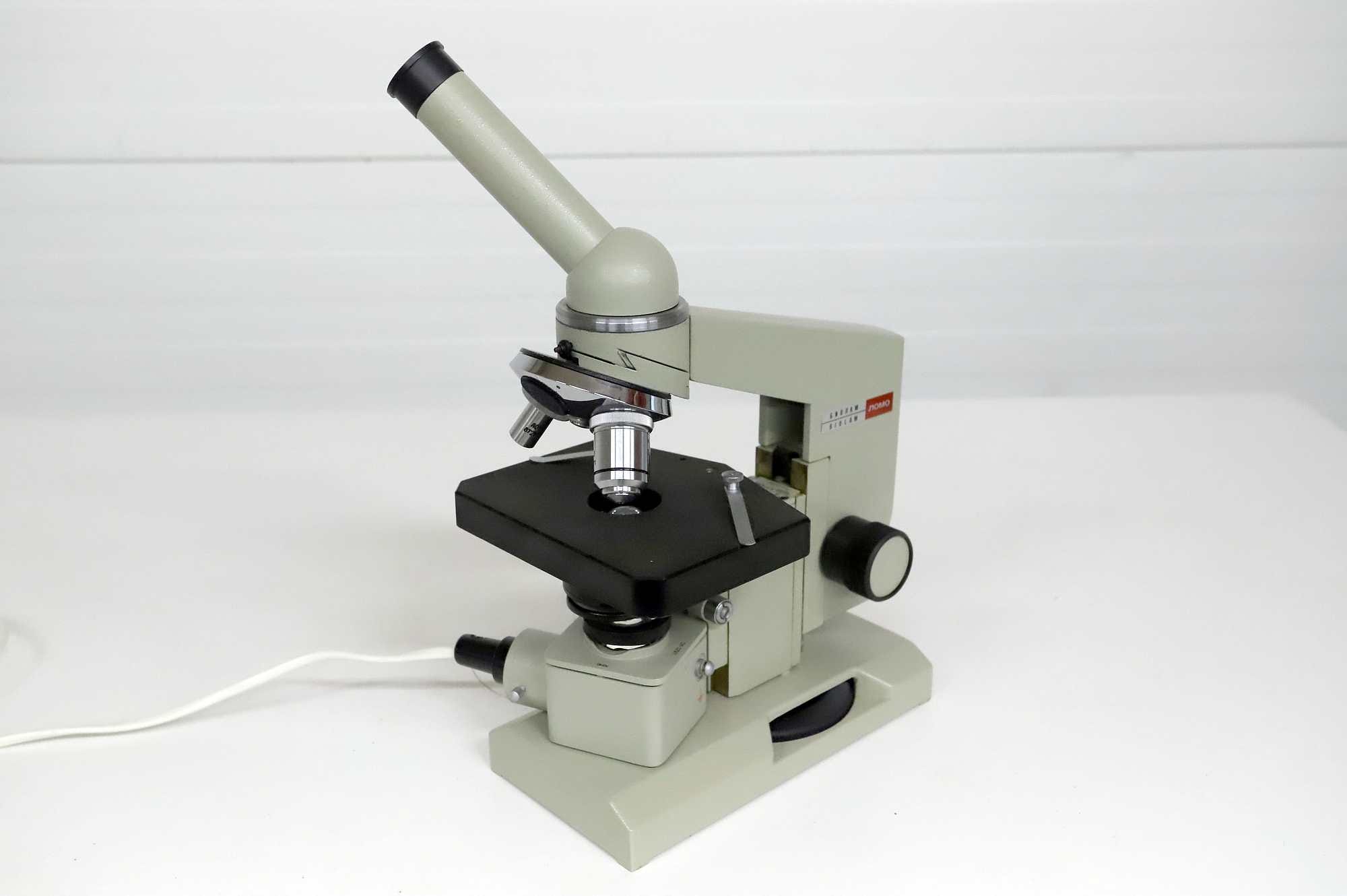 Nomo Biolam-mikroskooppi vanerilaatikolla ja varaosilla