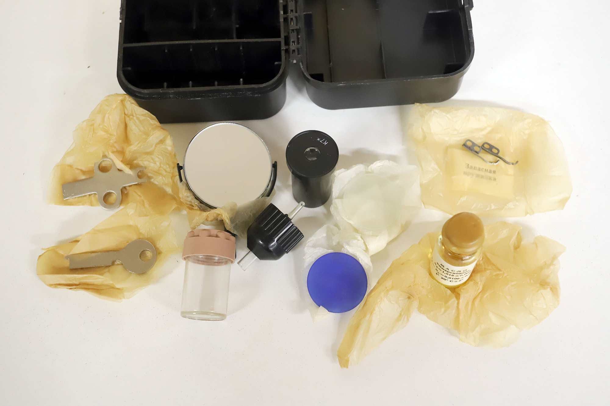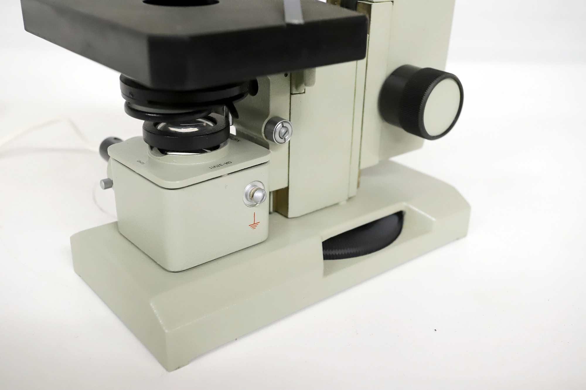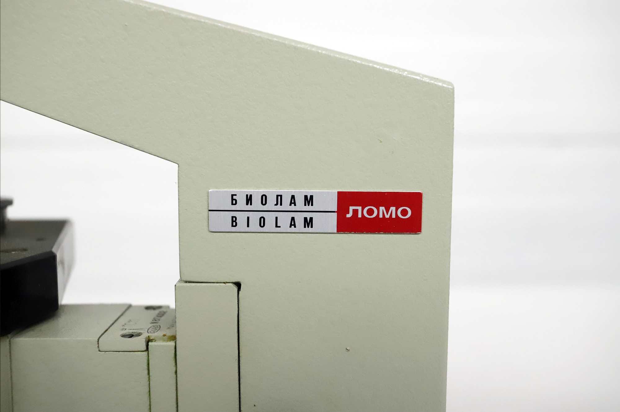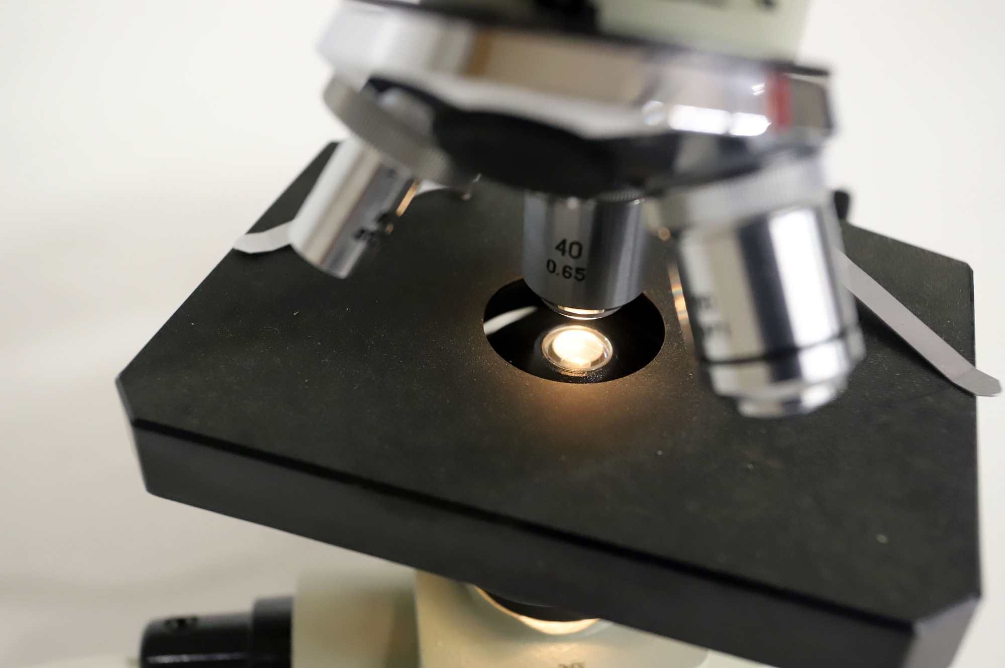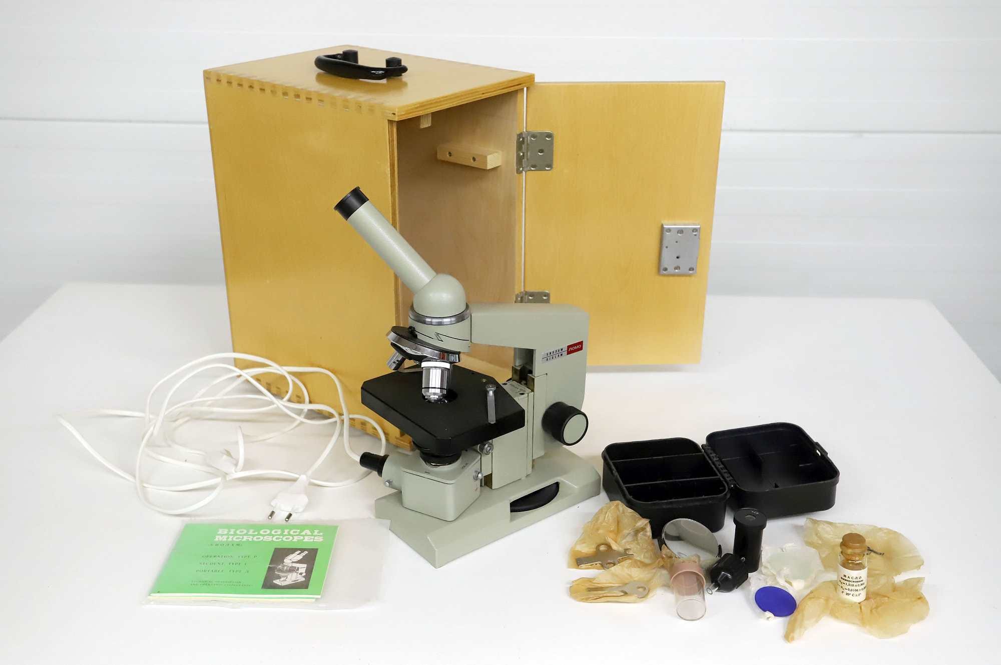 Nomo Biolam-mikroskooppi vanerilaatikolla ja varaosilla