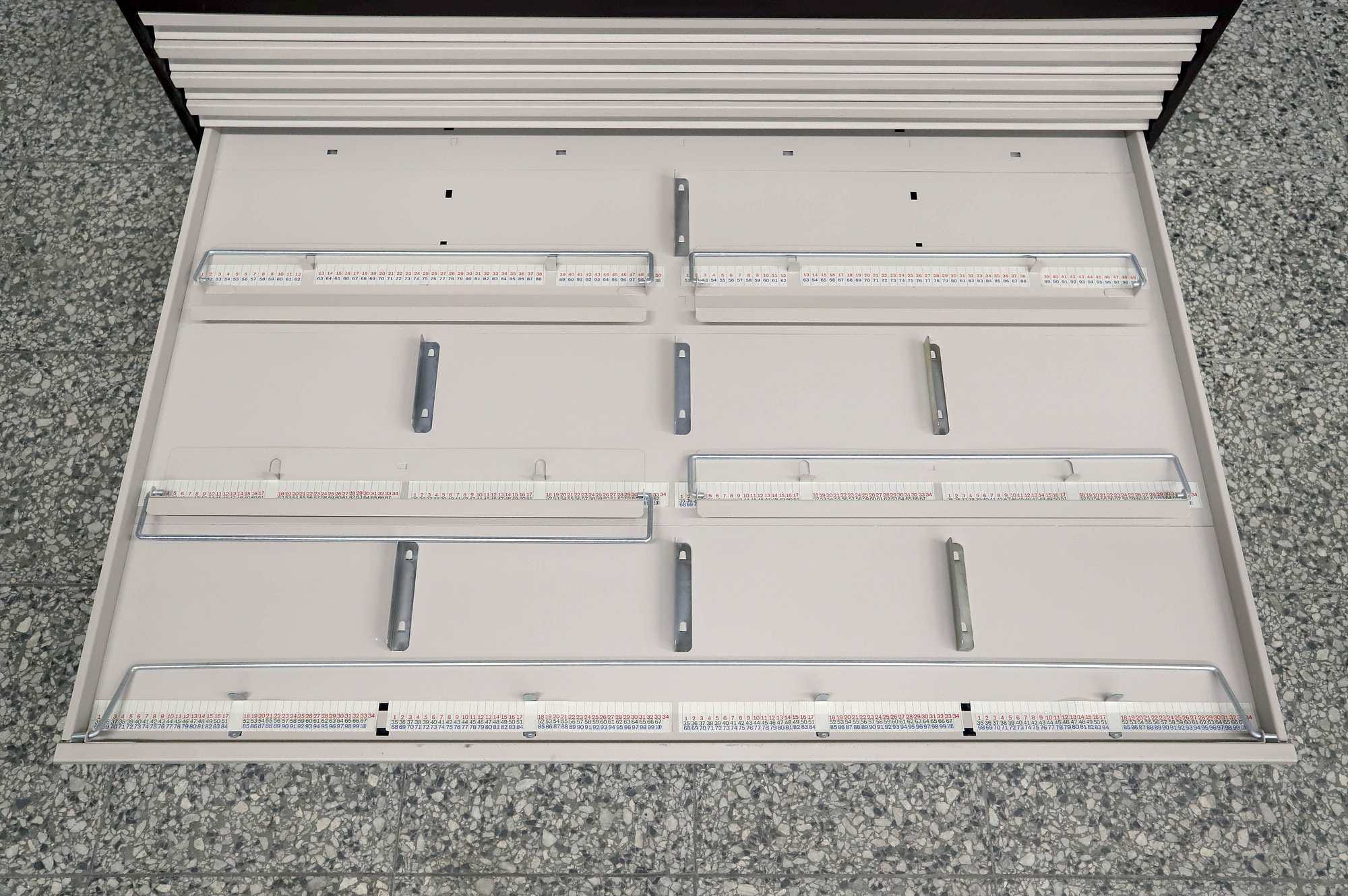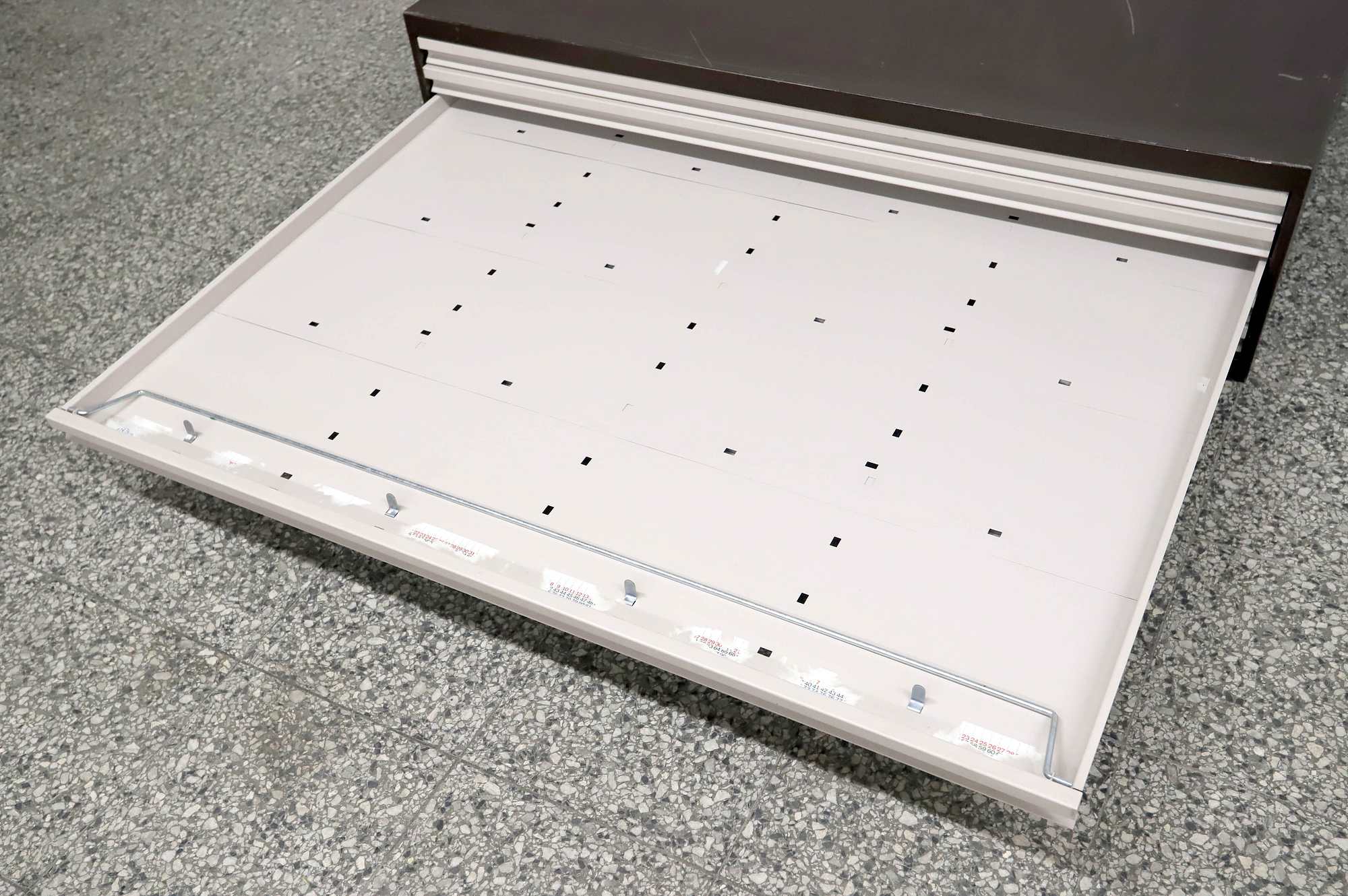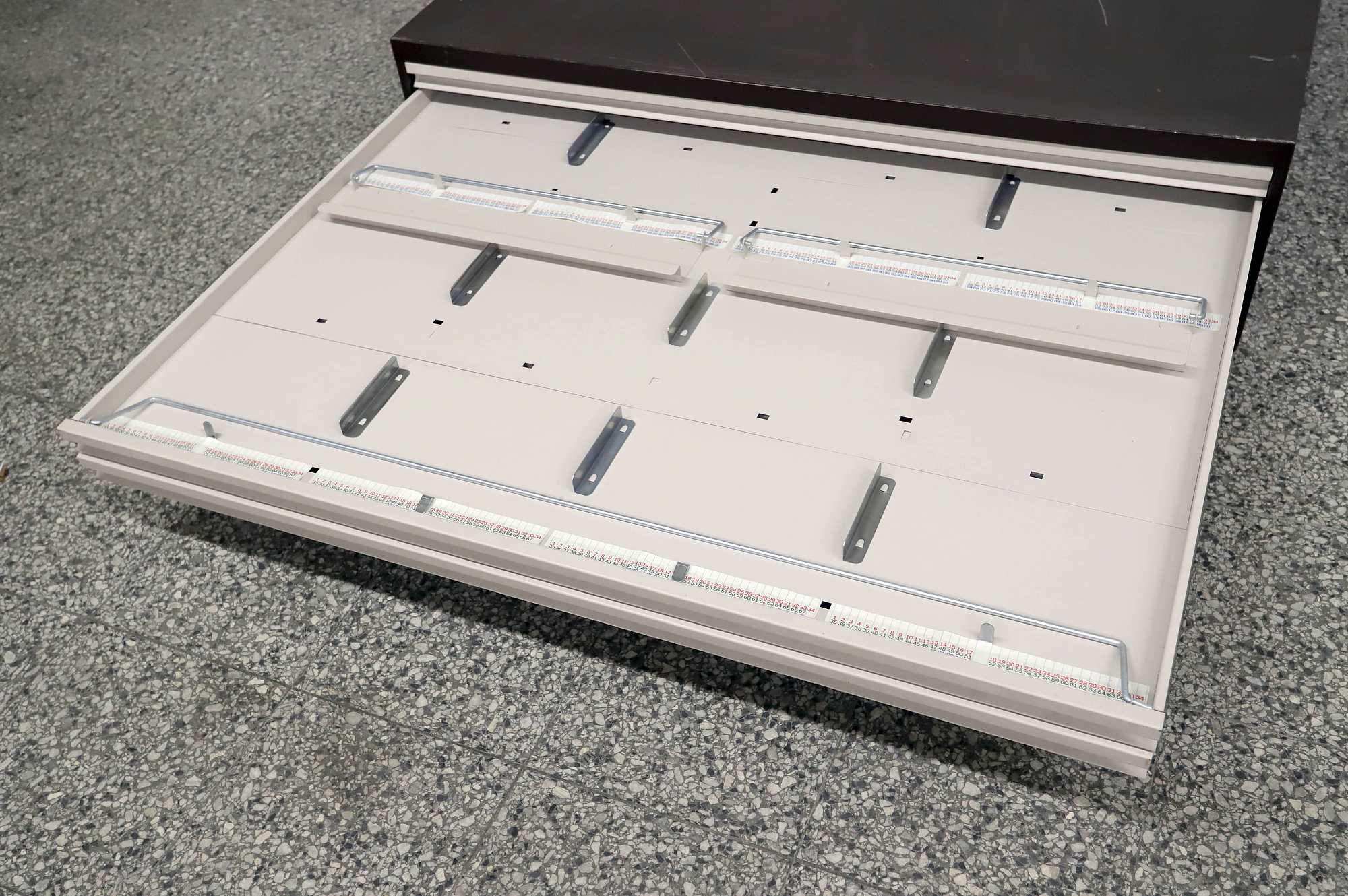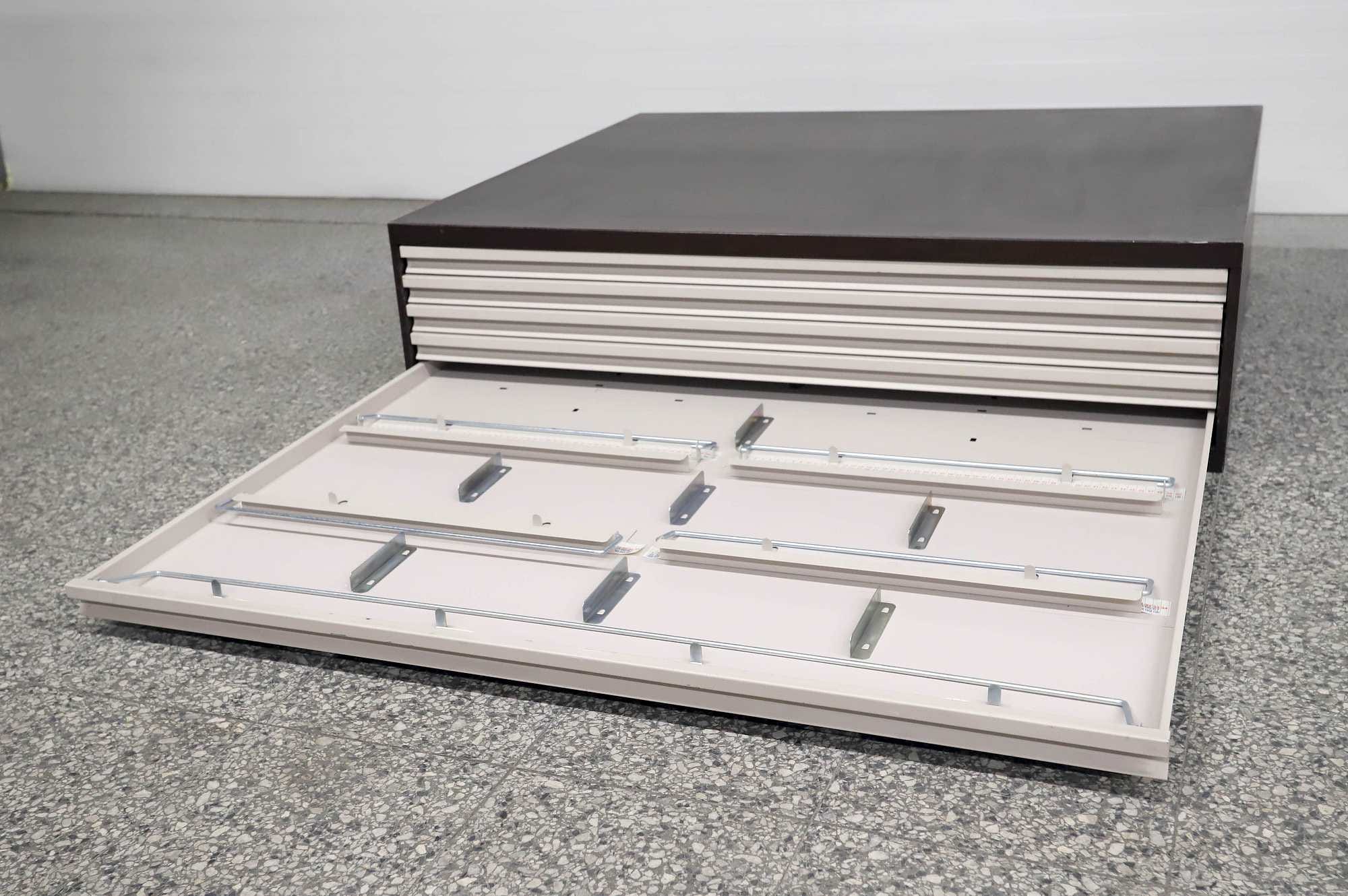 Peltinen piirustus-/vetolaatikosto.