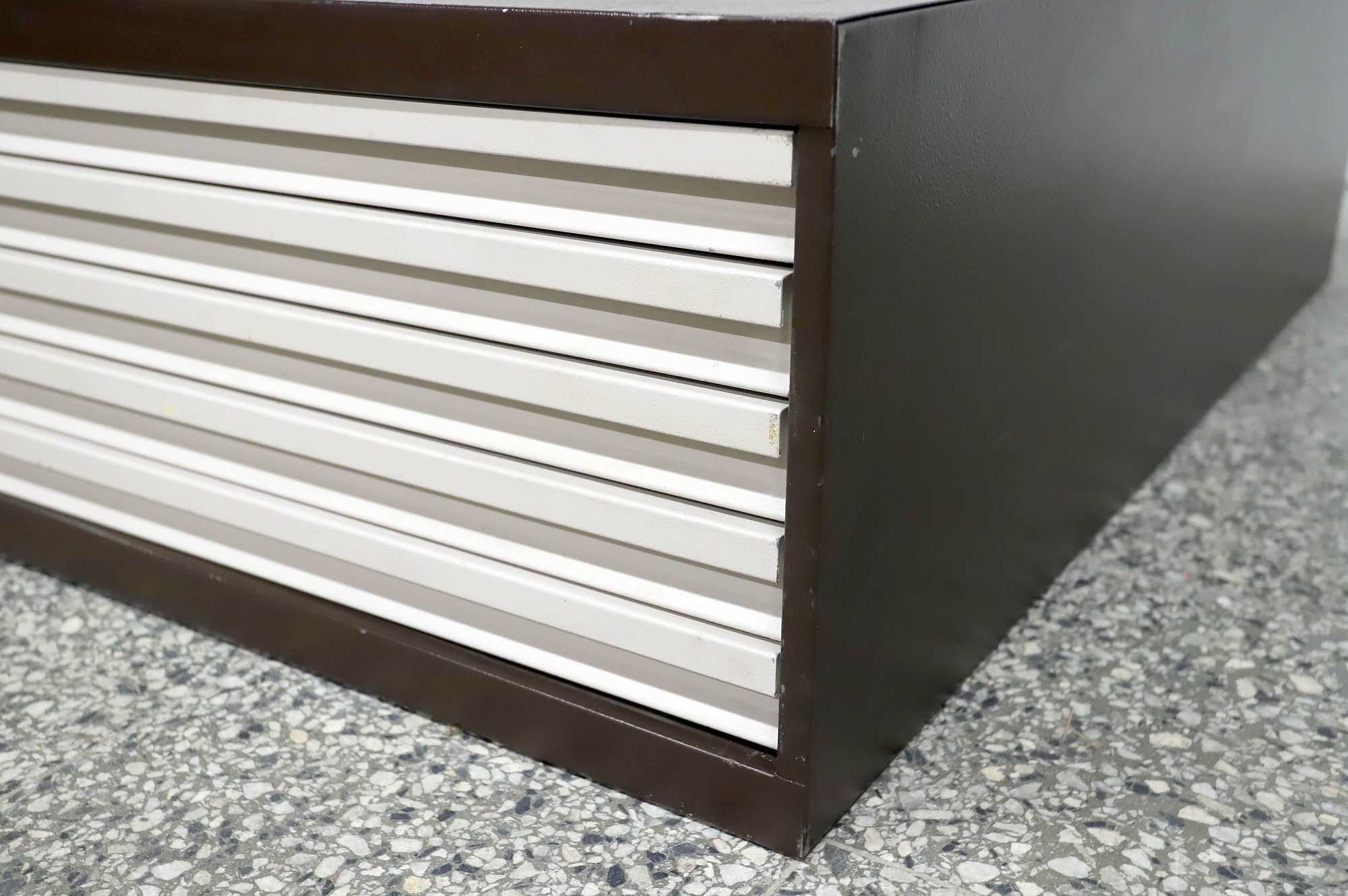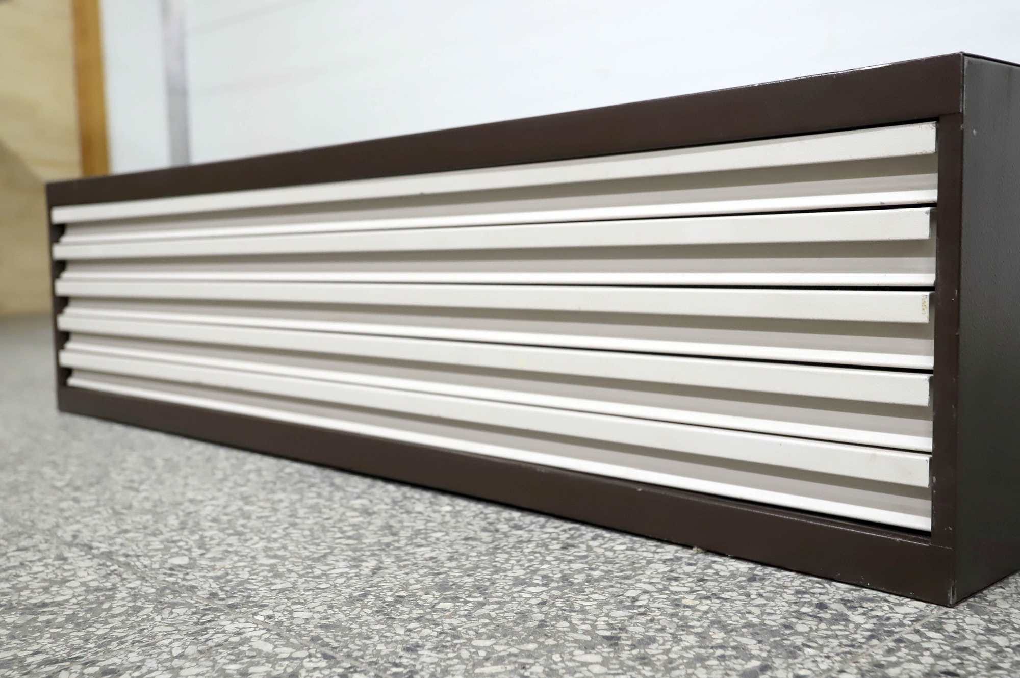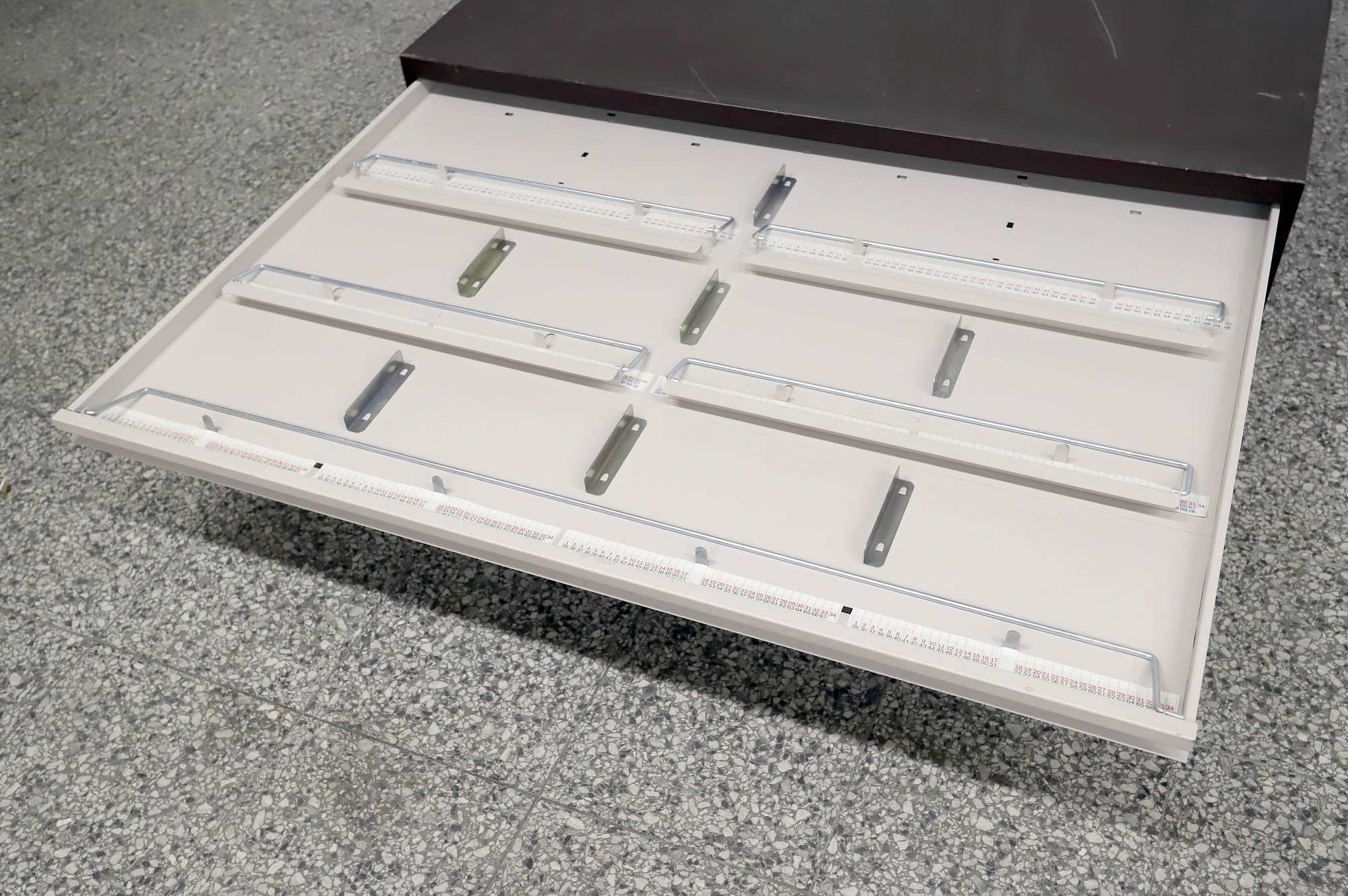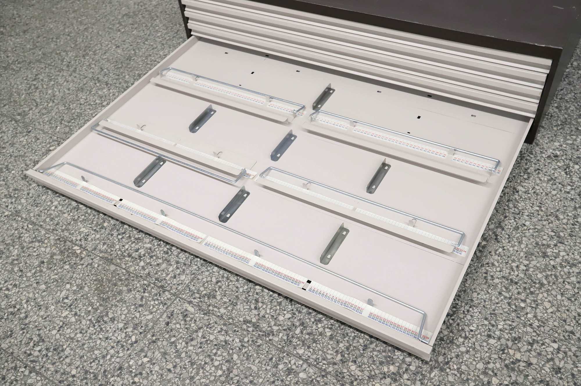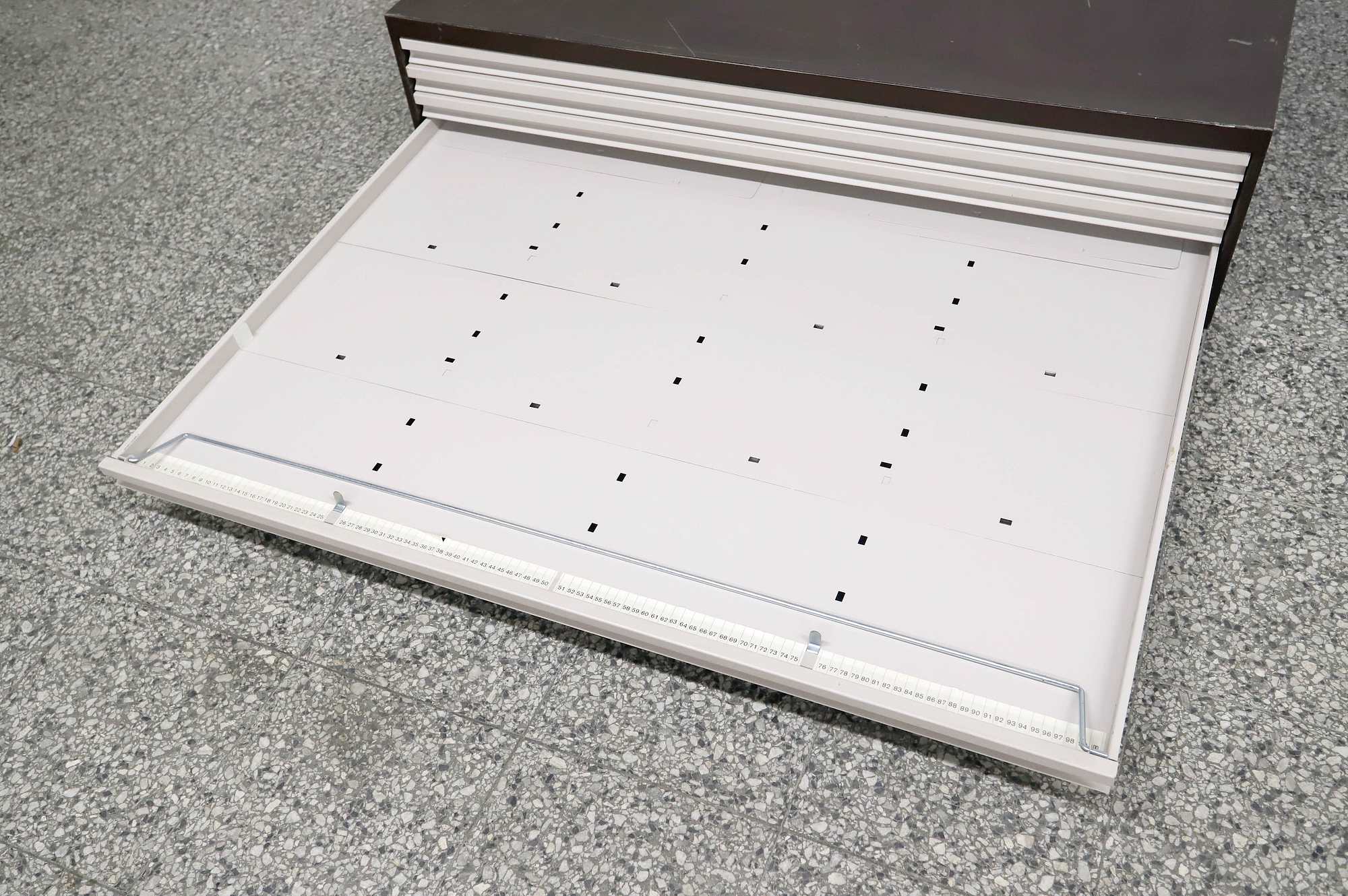Peltinen piirustus-/vetolaatikosto.