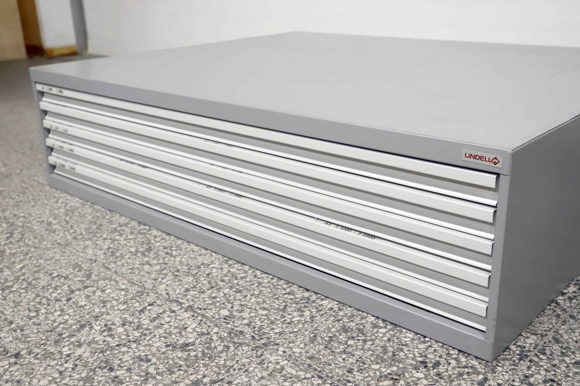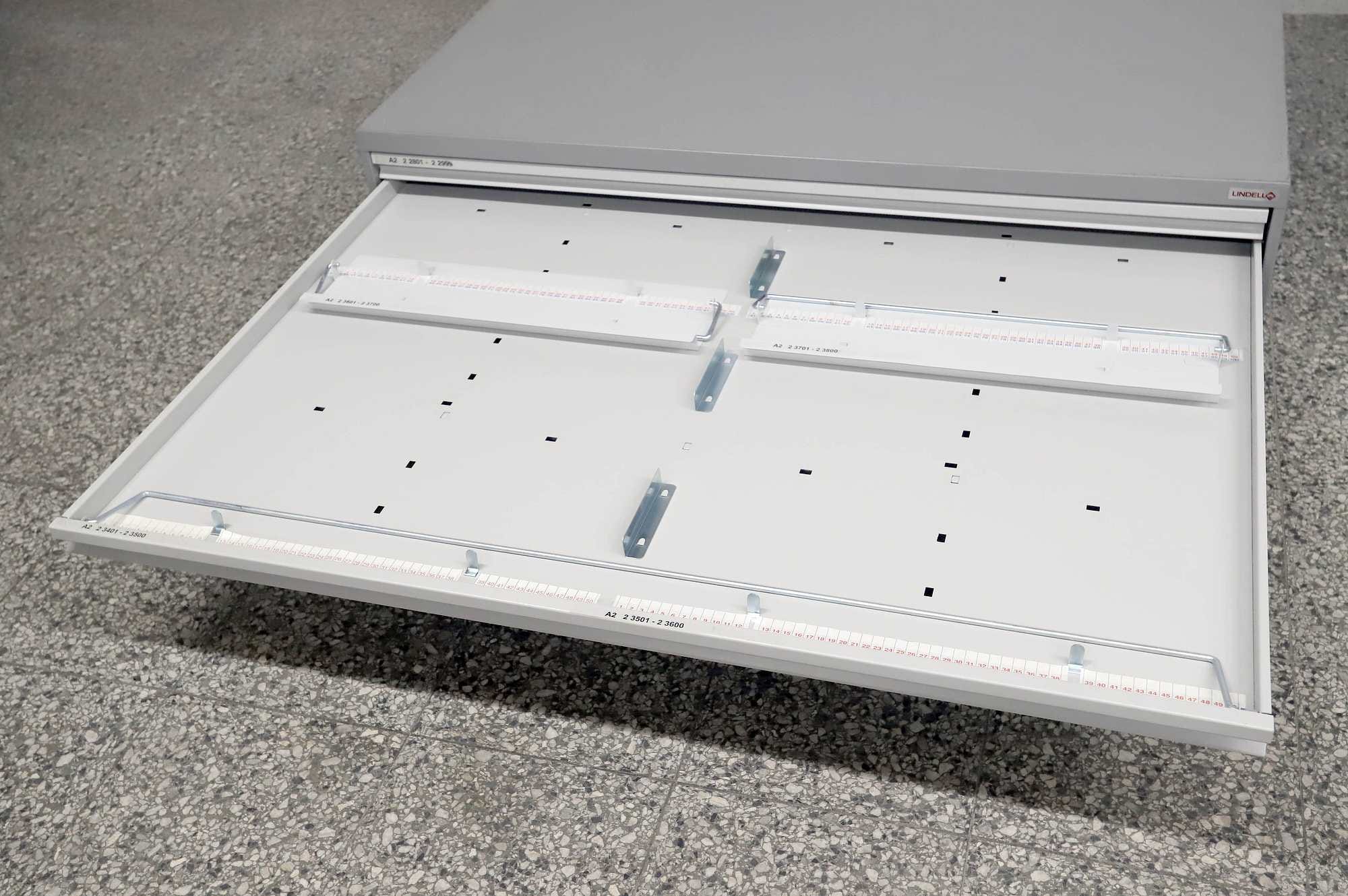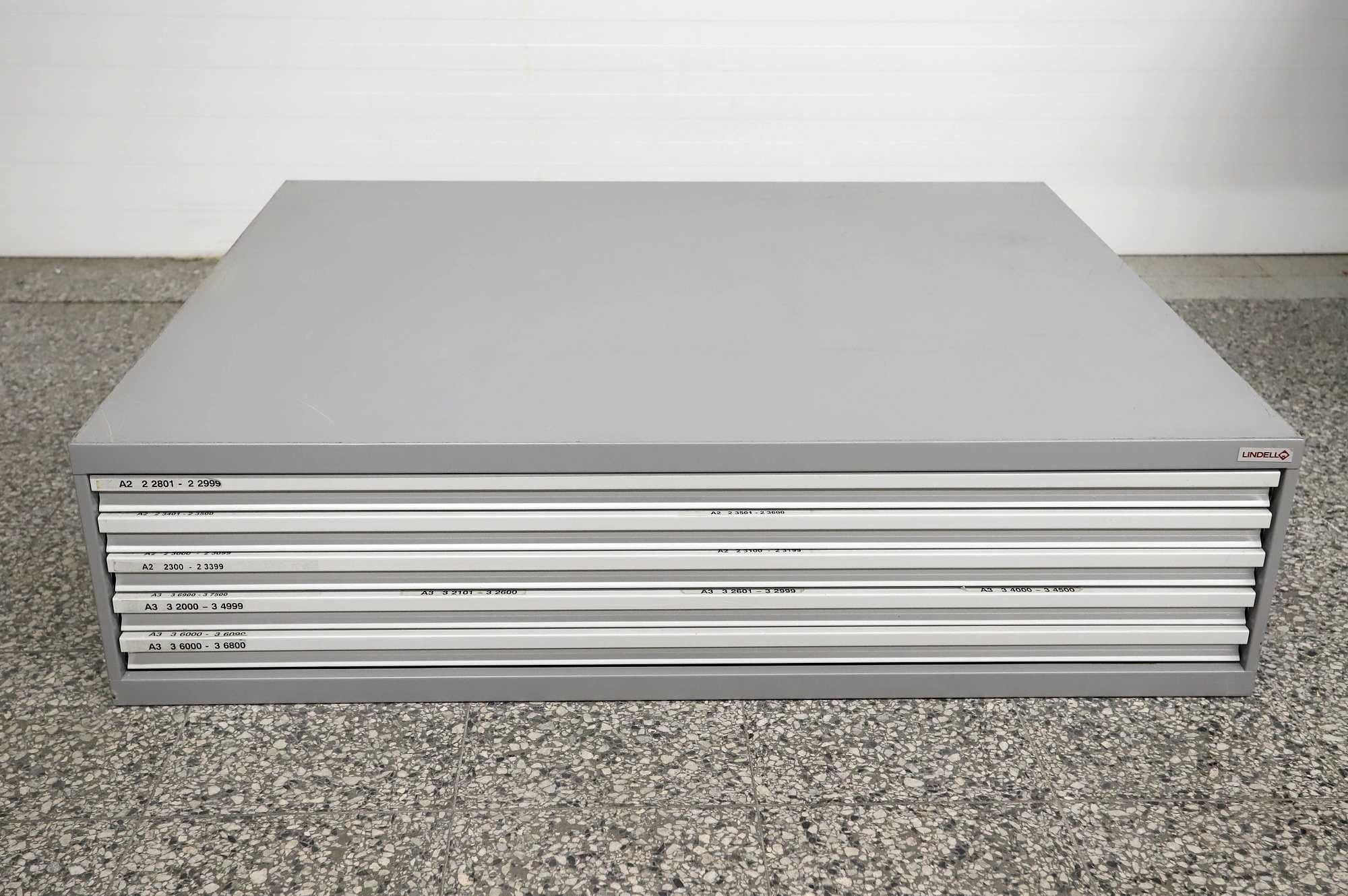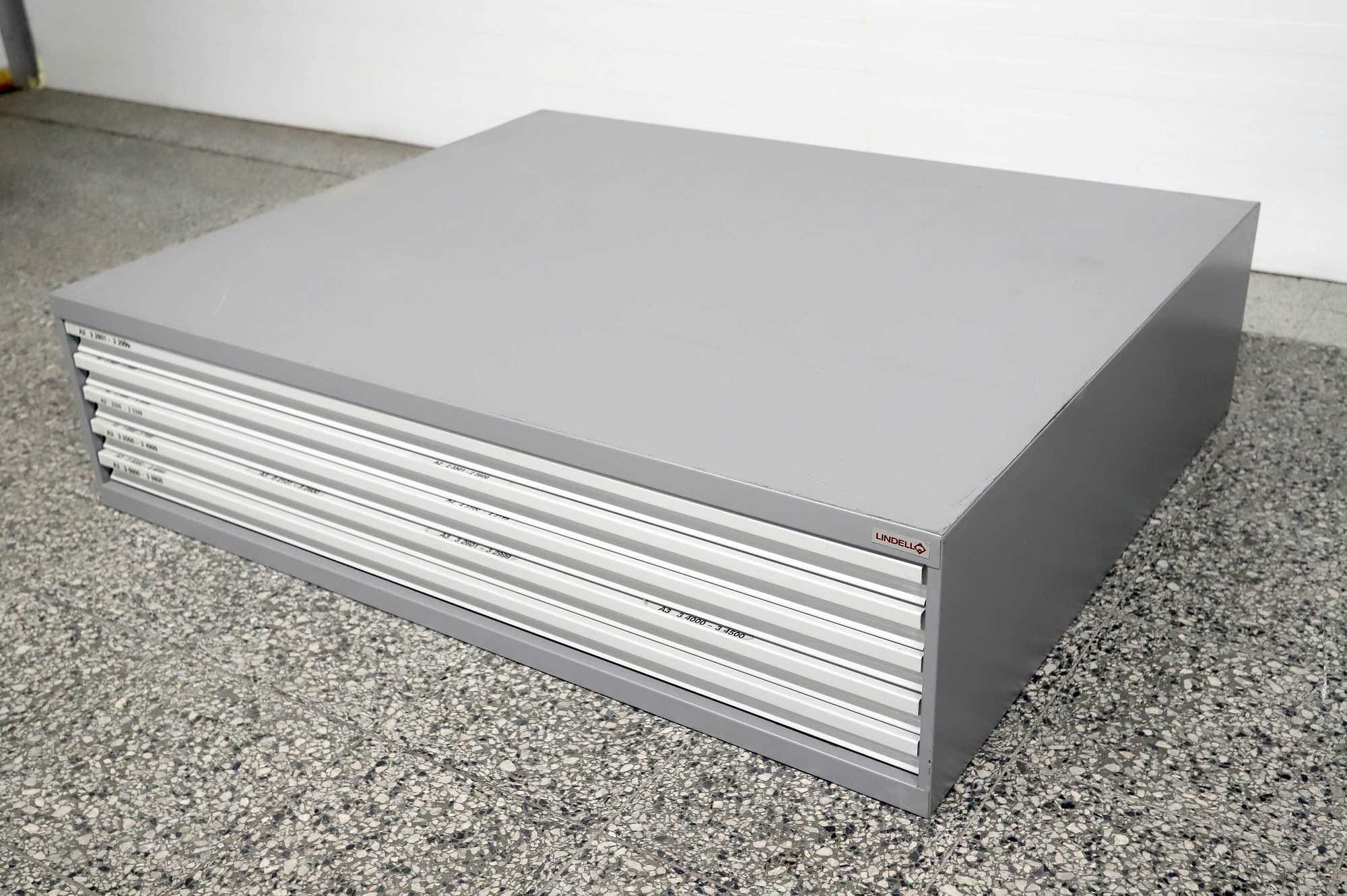 Peltinen piirustus-/vetolaatikosto.