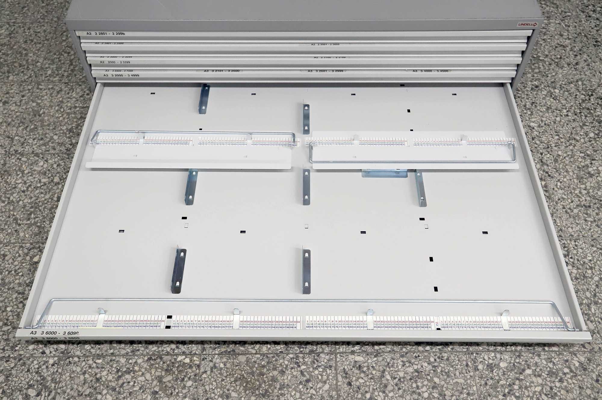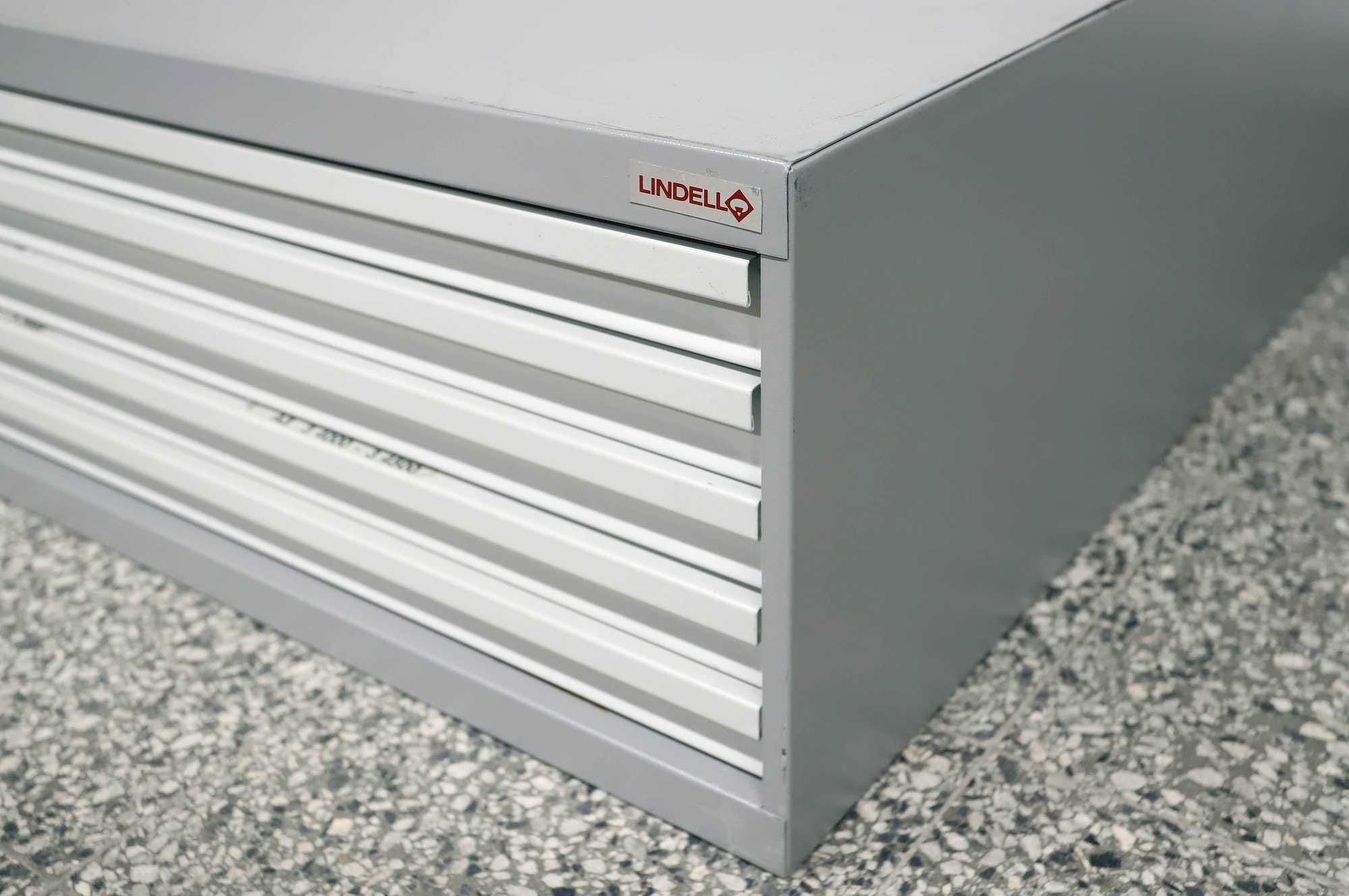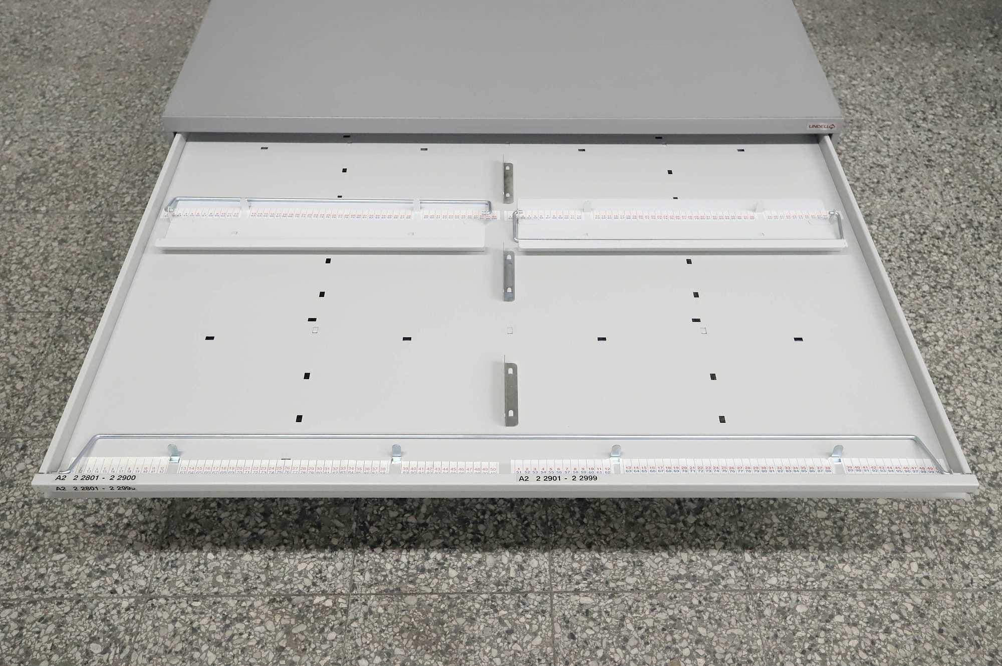 Peltinen piirustus-/vetolaatikosto.