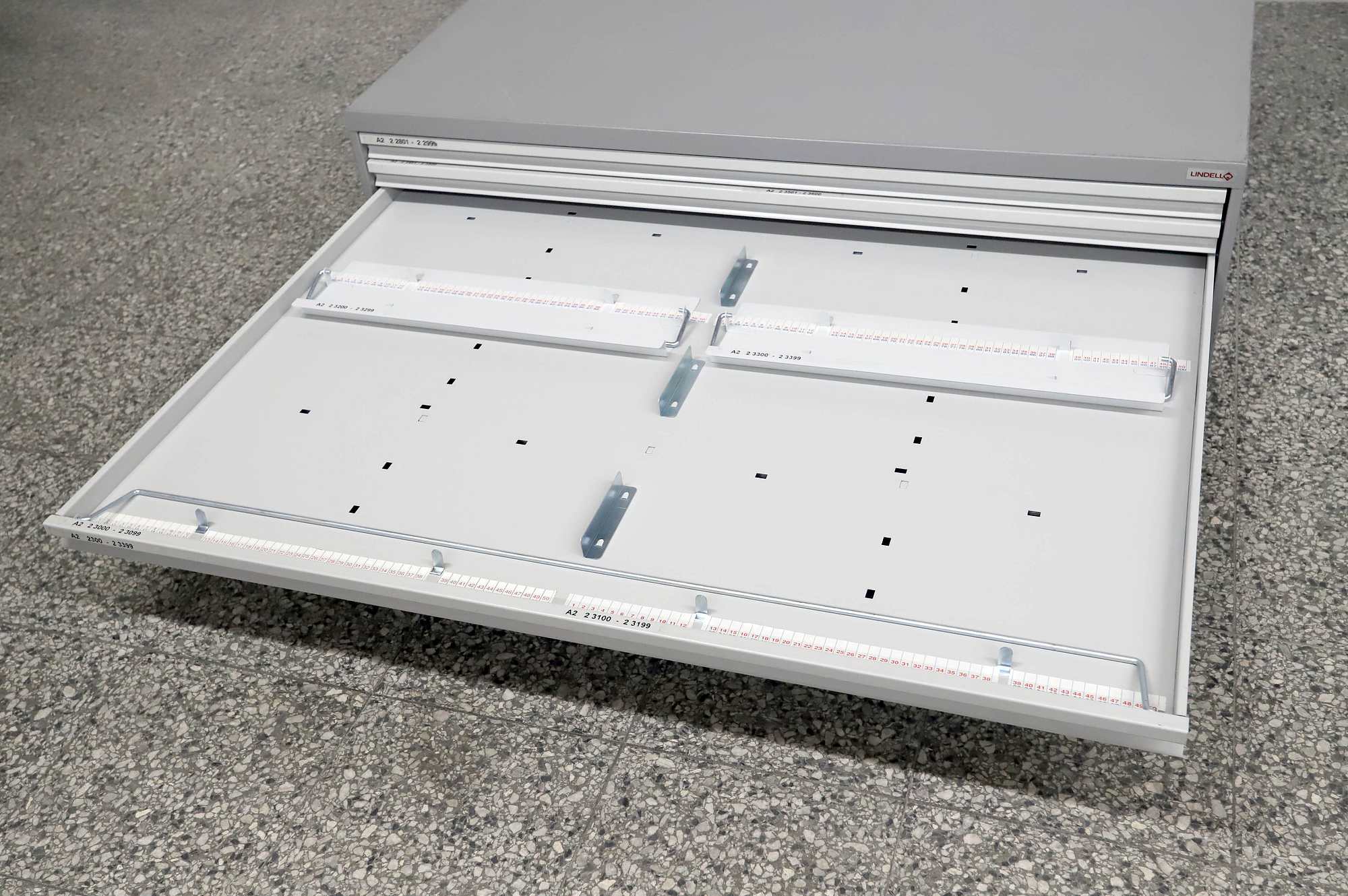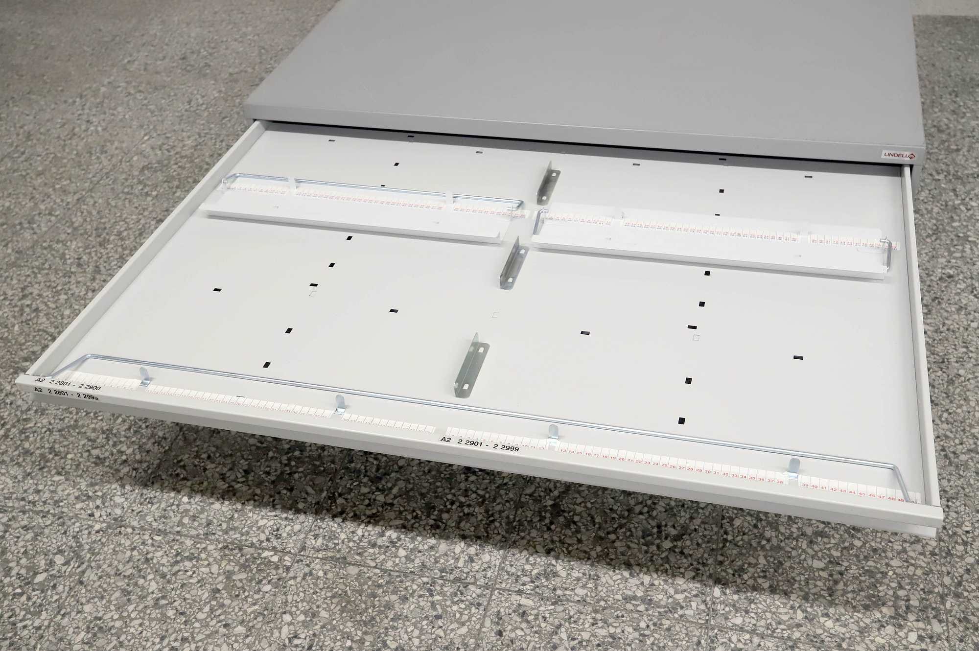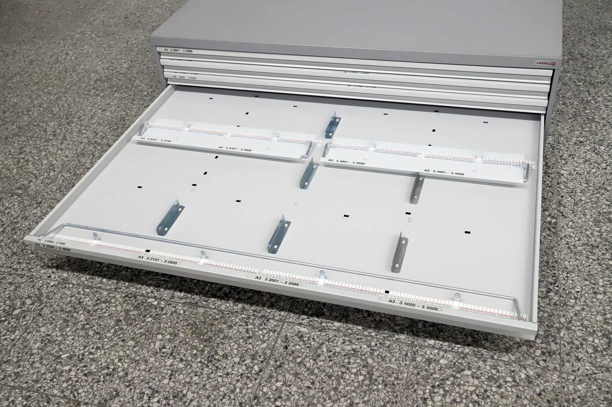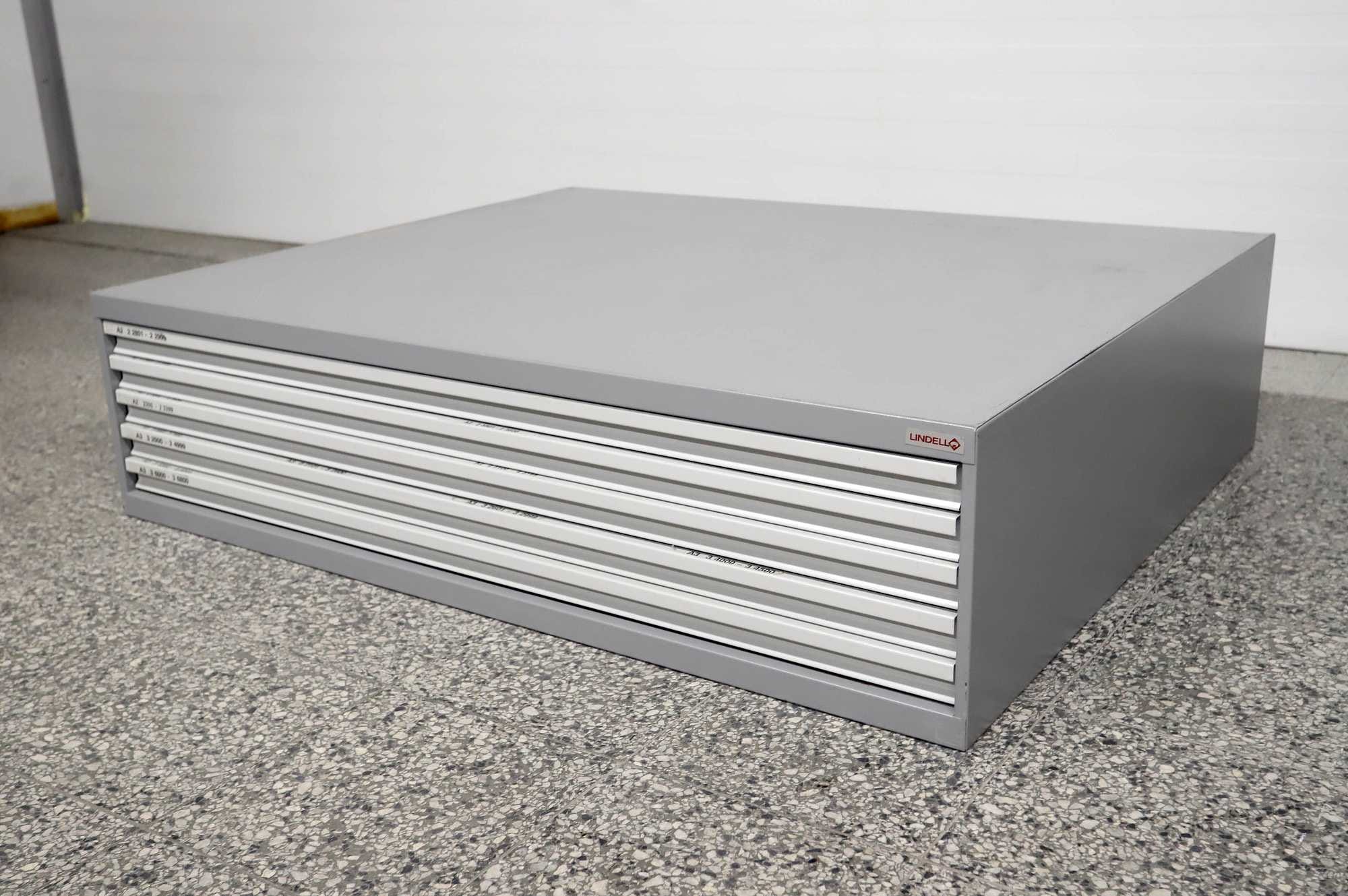 Peltinen piirustus-/vetolaatikosto.